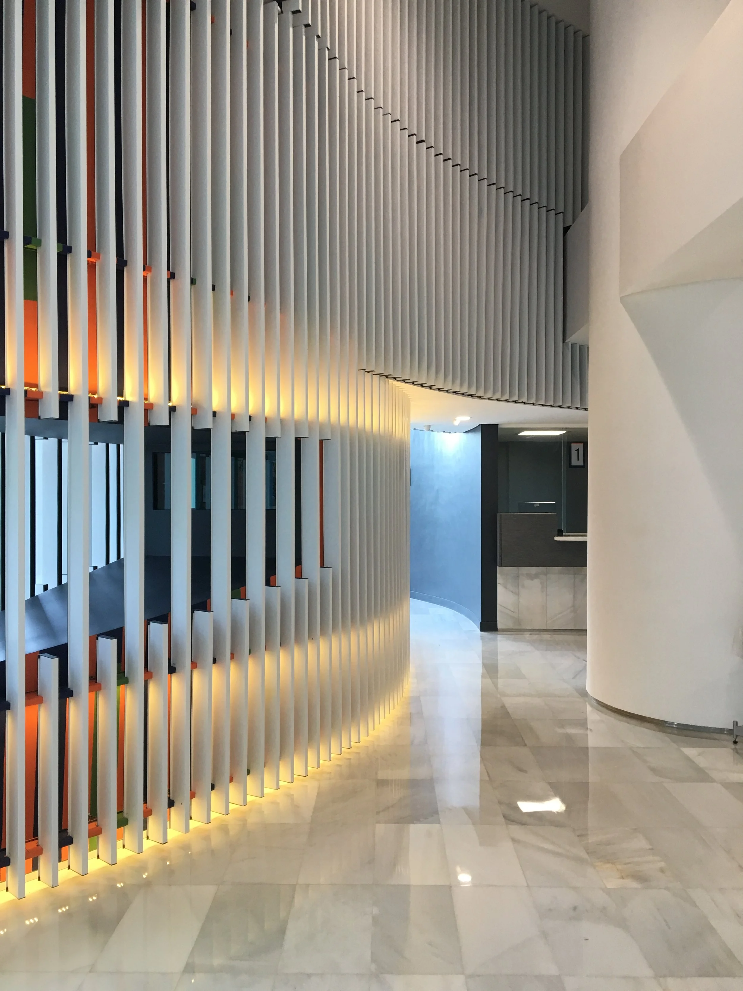 The edges of the baffles are finished with colored bands, creating a kinetic effect inspired by the bank’s corporate visual identity.