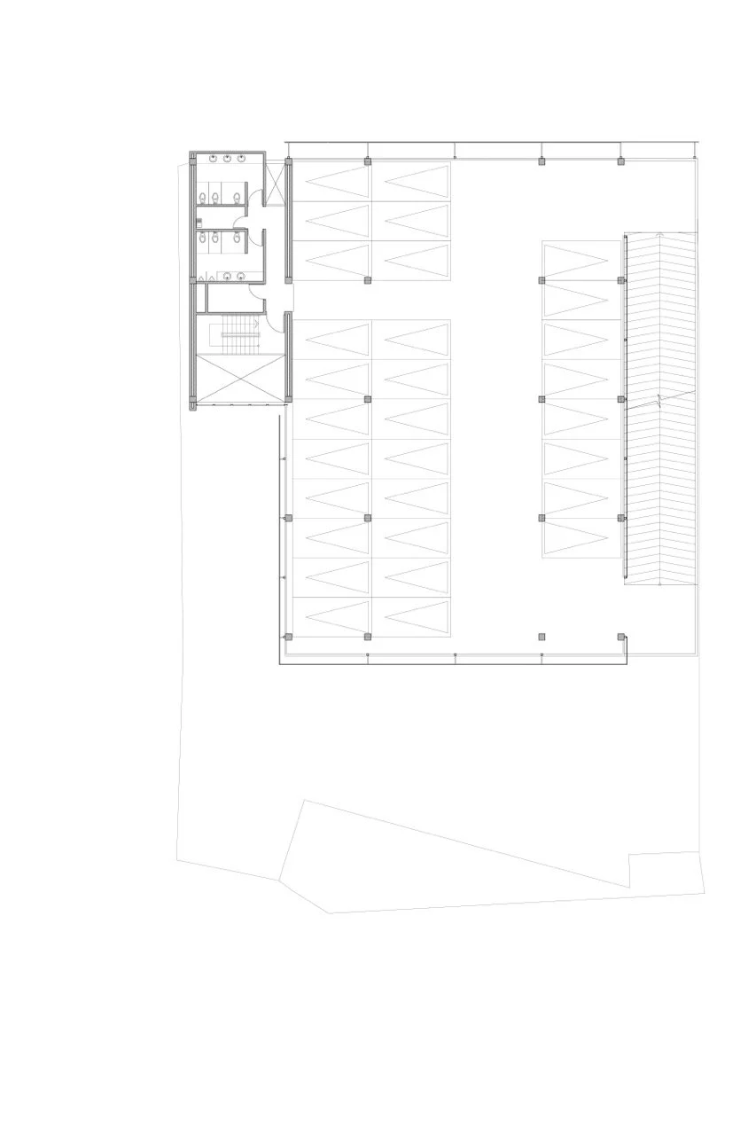 El nivel superior dispone de estacionamiento para 30 vehículos y un taller mecánico equipado con puentes, áreas de trabajo y depósitos.