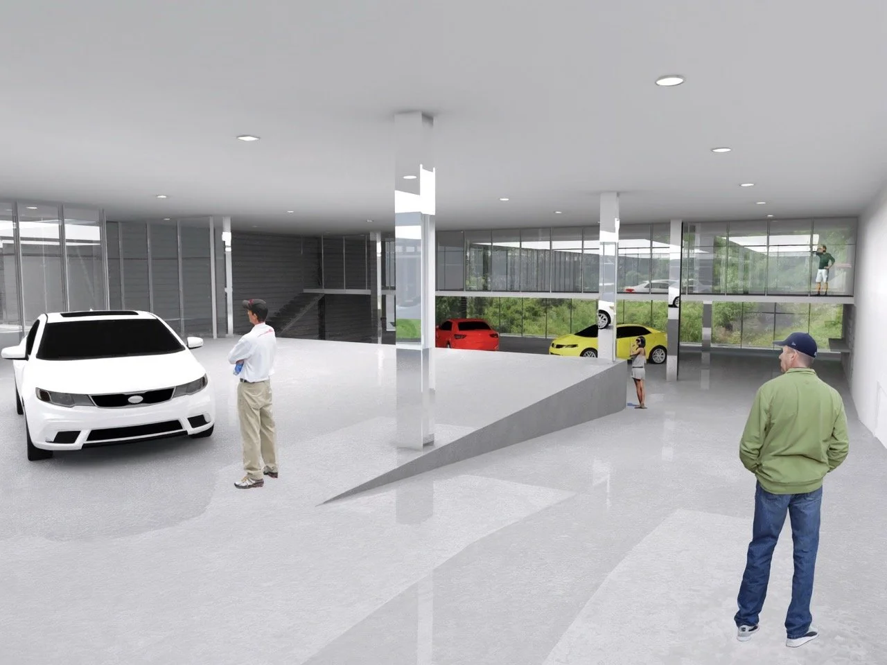 La planta baja se destina al concesionario, mientras que el nivel superior alberga el estacionamiento y el taller de servicio.
